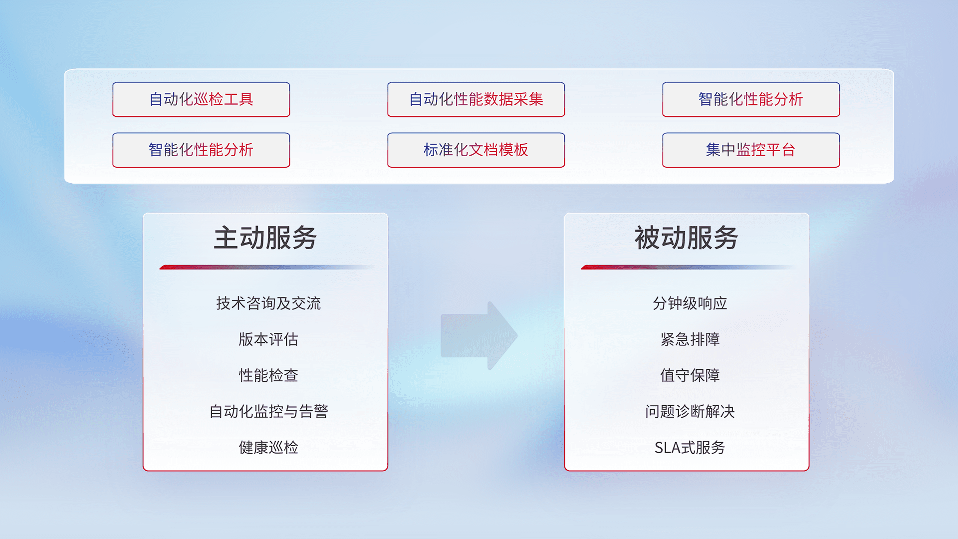 智能化工具和标准化文档,,,,保障服务质量,,,,提供主动服务(包含技术咨询、、版本评估、、、性能检查、、、、自动化监控与告警、、健康巡检)和被动服务包含(分钟级响应、、紧急排障、、、值守保障、、、问题诊断解决、、、SLA服务)。。。